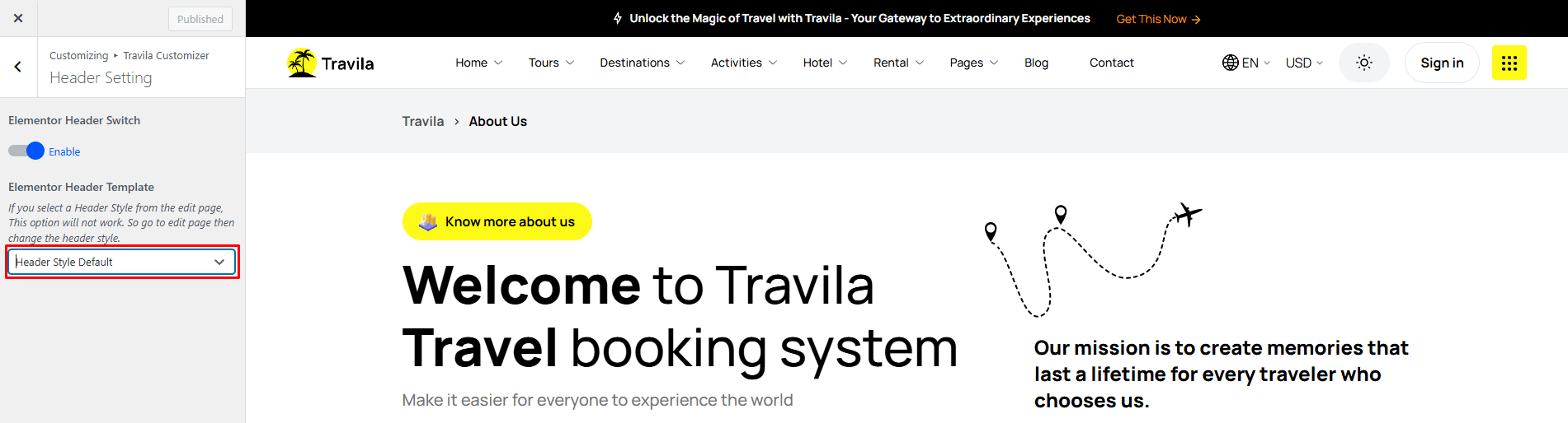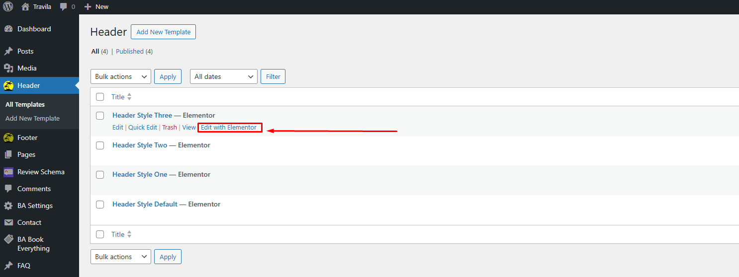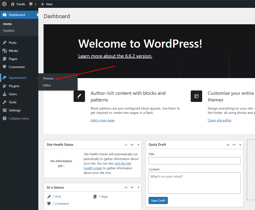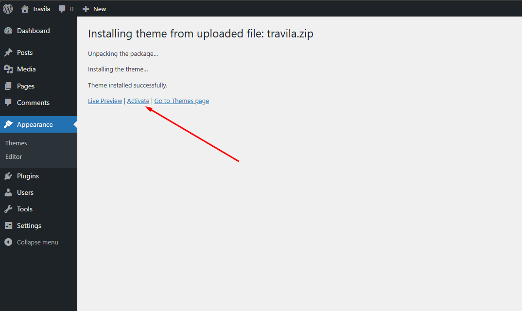 Once uploaded, activate the theme by heading to the “Themes” menu in the WordPress Dashboard. Locate the Travila Theme and hit “Activate”.