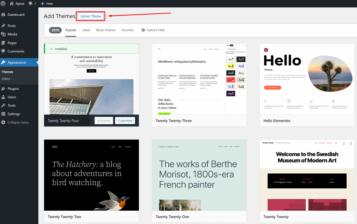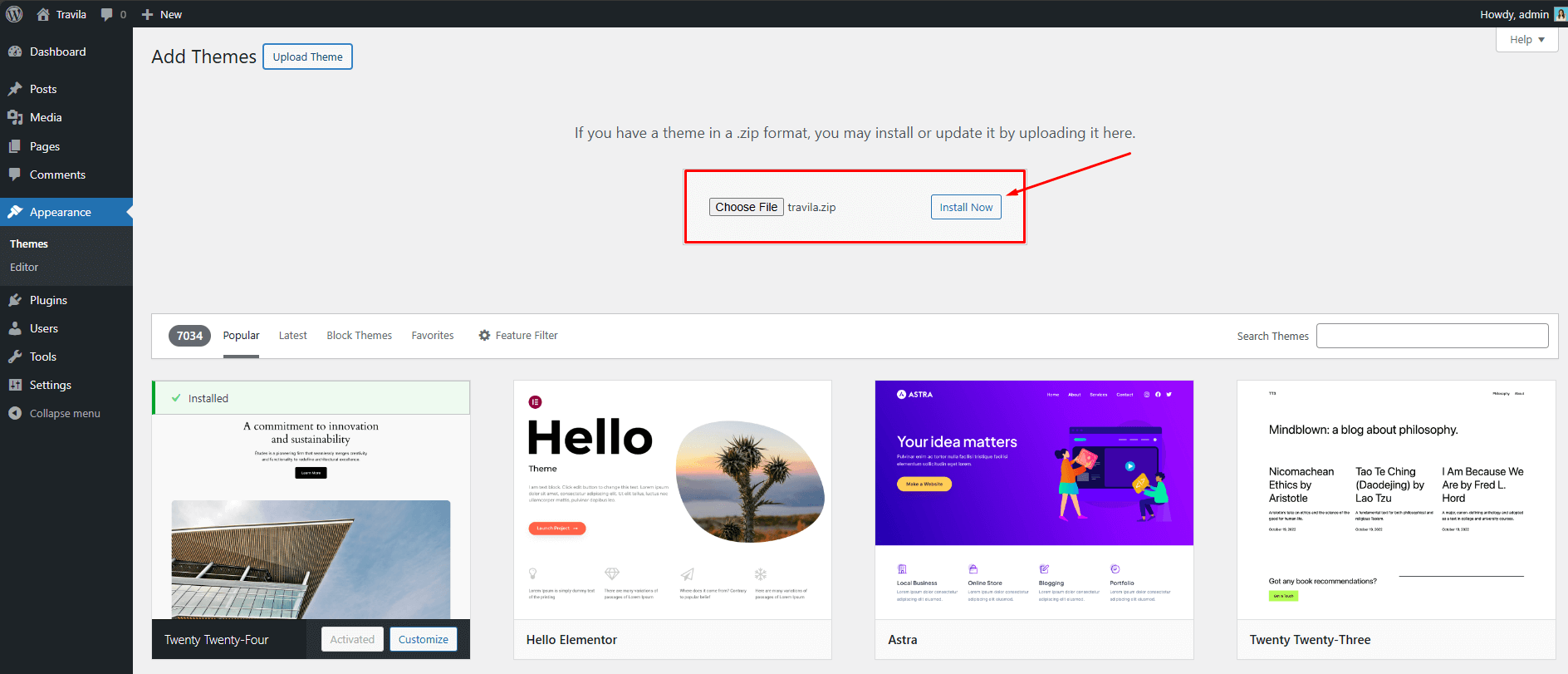 Note: When uploading your theme with the installer, please ensure you are uploading the theme .zip file, not the entire package you downloaded. In this case, you will be uploading travila.zip